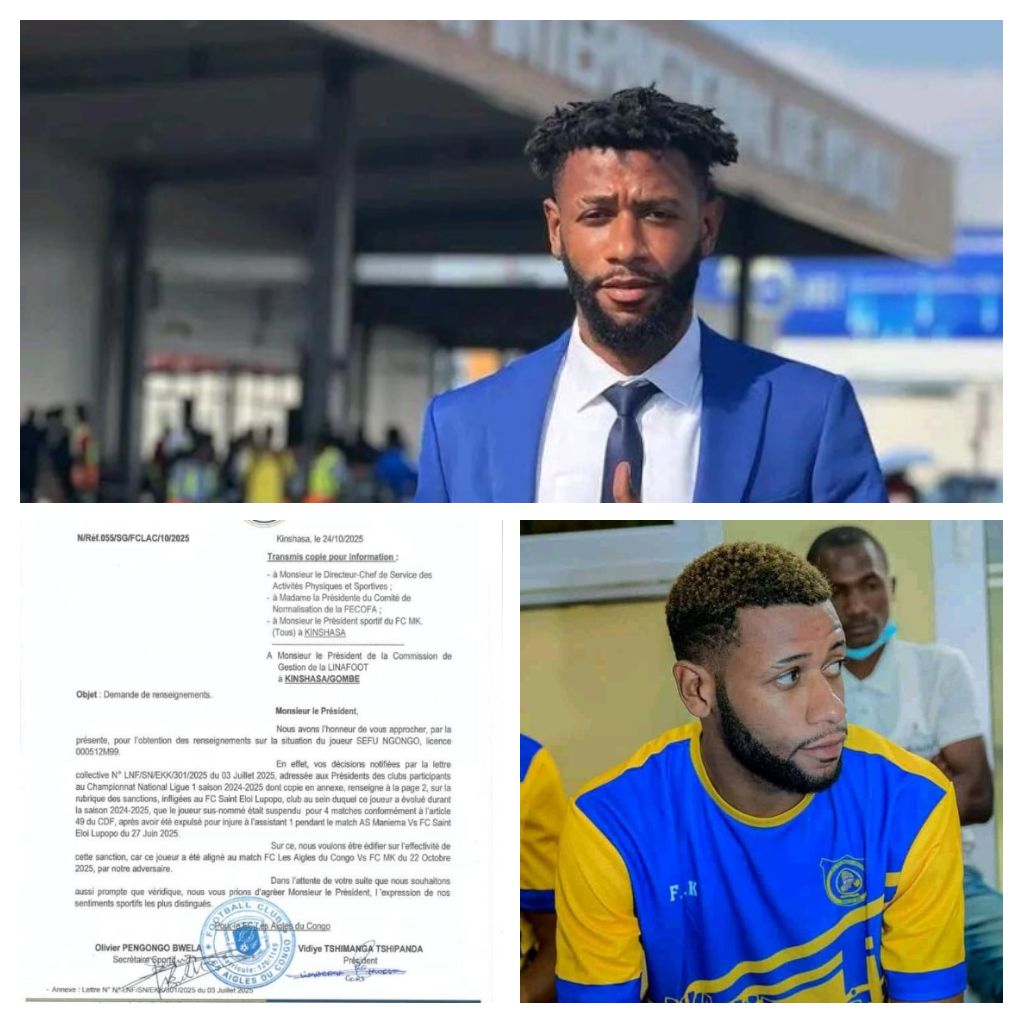 L’alignement du joueur Sefu Ngongo, le 22 octobre 2025, lors du match de la première journée du championnat de l’Ilicocash Ligue 1 qui avait opposé le FC MK, son club, au FC Les Aigles du Congo, a conduit ce dernier à non seulement le dénoncer en s’appuyant sur certaines dispositions des lois du jeu régissant le football en République Démocratique du Congo mais aussi à pousser l’entité subdélégataire à sanctionner le FC MK.